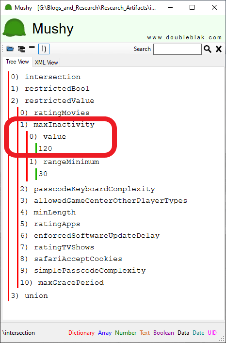 To find this value key integer within the PublicEffectiveUserSettings.plist you will need to find the restrictedValue key, then the maxInactivity key. Once you have located these keys you will notice an integer that represents the setting value in seconds, as seen in Figure 4.