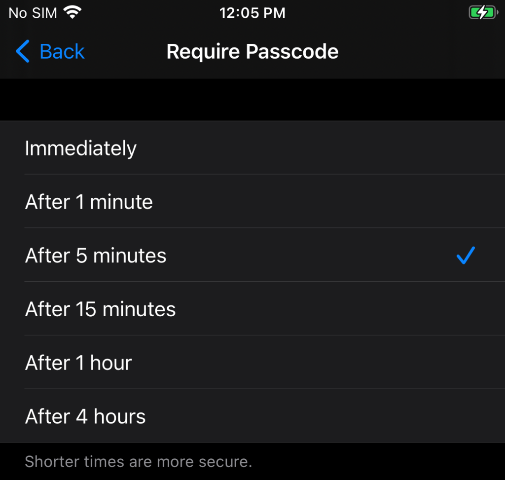 During testing, the Require Passcode options were Immediately, After 1 minute, After 5 minutes, After 15 minutes, After 1 hour and After 4 hours: