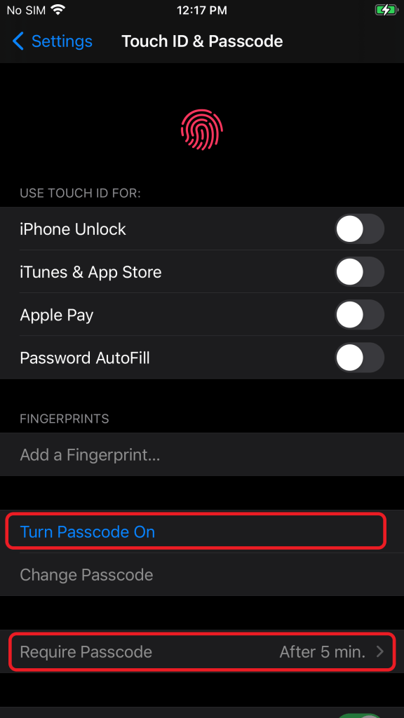 Touch ID & Passcode Require Passcode Setting: