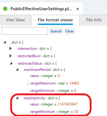To find this value key integer within the PublicEffectiveUserSettings.plist you will need to find the restrictedValue key, then the maxGracePeriod key. Once you have located these keys, you will notice an integer that represents the setting value in seconds, as seen in Figure 7.