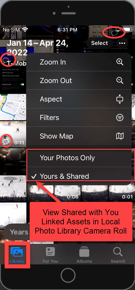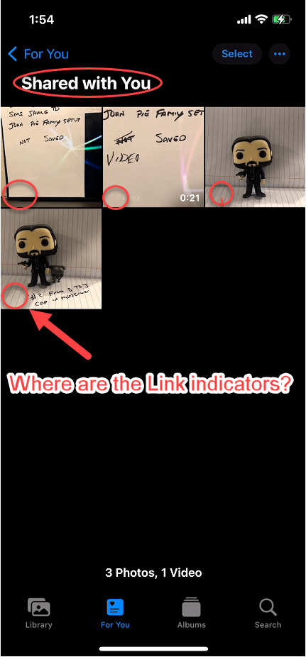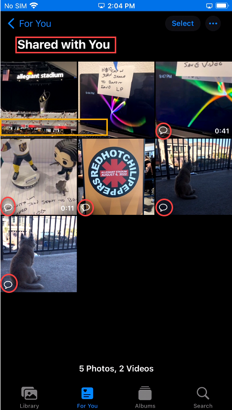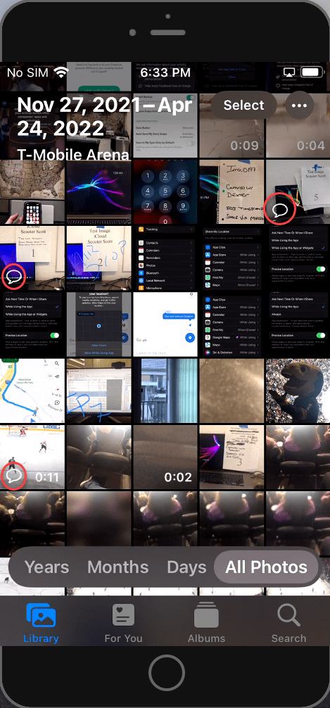 Based on what I’ve observed, when searching and viewing assets on a device within the Photos Application, assets that have a small message chat bubble in the lower left corner of the asset preview\thumbnail are called Shared with You Syndication Photo Library linked asset. There are some other on device indicators, but those will be covered in different sections of this write up.