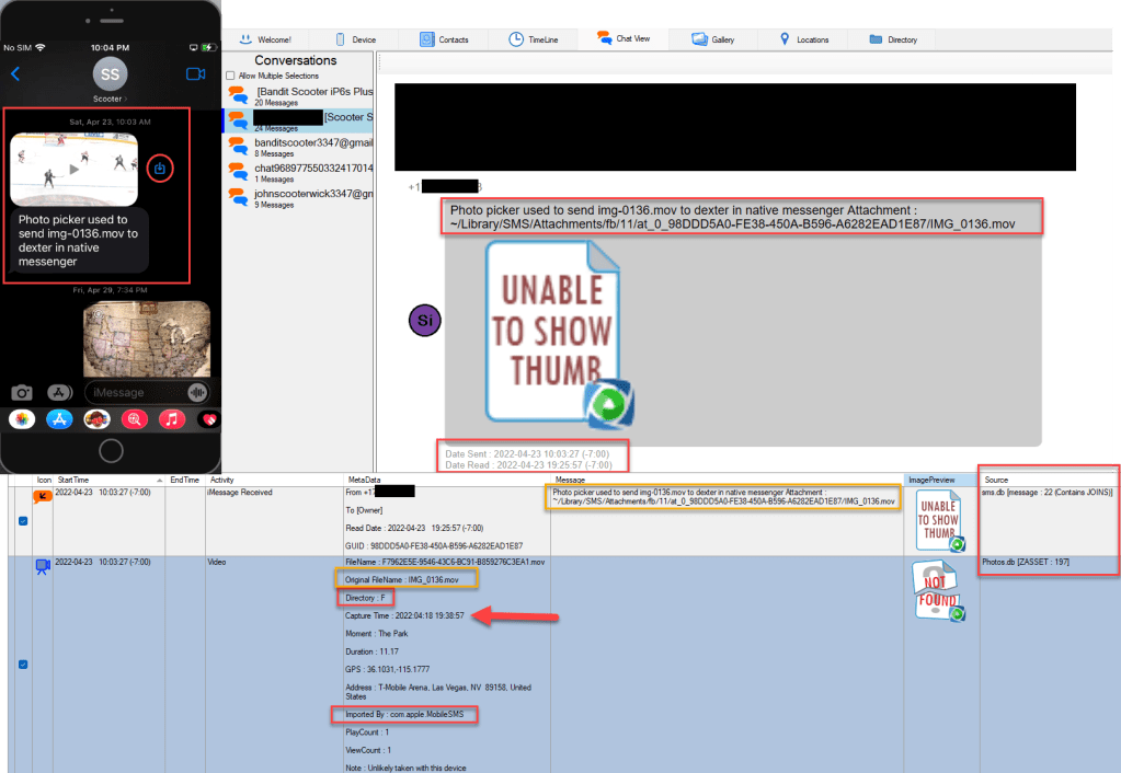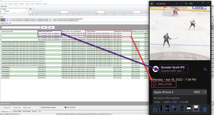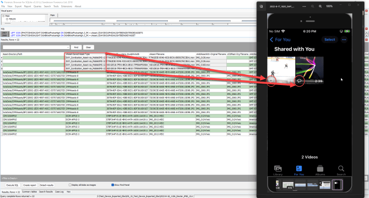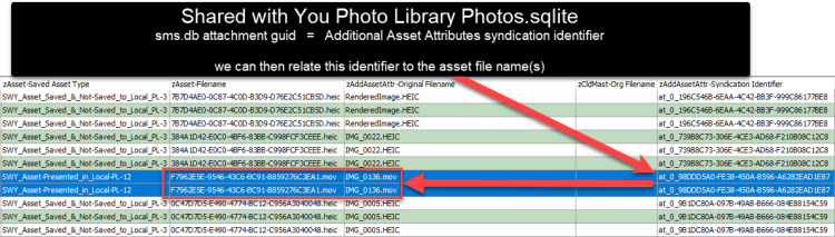 Using these databases, we can follow the asset from being a message attachment, to being an asset listed in the Shared with You Syndication Photo Library linked asset Photos.sqlite, to an asset being displayed on the device in the Local Photo Library as a Shared with You linked asset.