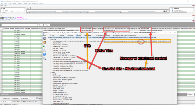 Not captured within figure #54, but the ZASSET table ZDATECREATED timestamp is when the original asset (IMG_0136) was captured on the iPhone X. In this specific instance, the Add Date timestamp matches when the message attachment was received on the device and the asset was added to the Shared with You PL Photos.sqlite and the Local PL Photos.sqlite.