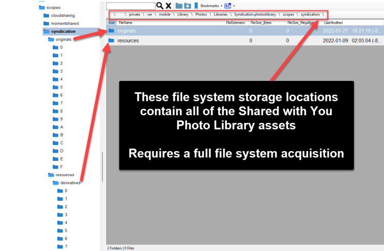 The following file system locations store only Shared with You Syndication Photo Library linked assets. These file paths and assets are a part of the Local Photo Library and in most cases, are visible to the user, on the device. These file system locations can be found in full file system acquisitions, iTunes back-up acquisitions, and possibly other lower level forensic acquisitions:
