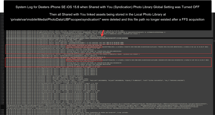 During my testing, when I turned off the Global Shared with You setting located at Settings > Messages > Shared with You, there were indications that several files were deleted. This was viewed within the System Log which can be monitored using MacOS Console or a third-party tool like iBackupBot. In figure #55, we can see two assets that have been displayed on the device via with Shared with You Syndication Photo Library links were deleted. I was unsure of which assets were being deleted, was it the assets being stored with in the Local Photo Library or the assets being stored in the Shared with You Syndication Photo Library?