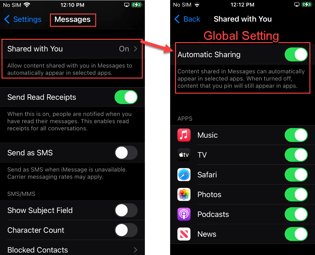 Settings exist that allow users to control what content is shared outside of Messages. They can use settings at the following levels to allow\restrict shared content from Messages: