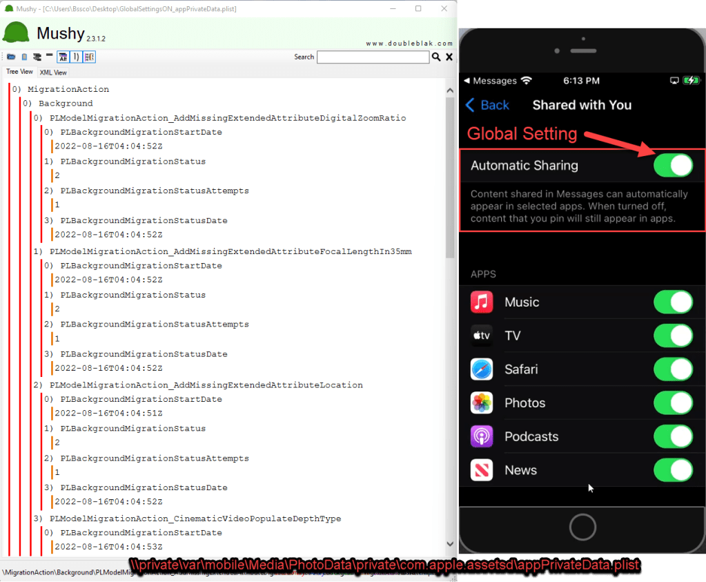 In this section, I will discuss the property lists (plist) associated with the Shared with You settings. There are four (4) properties lists (plist) you should locate and analyze when reviewing this data: