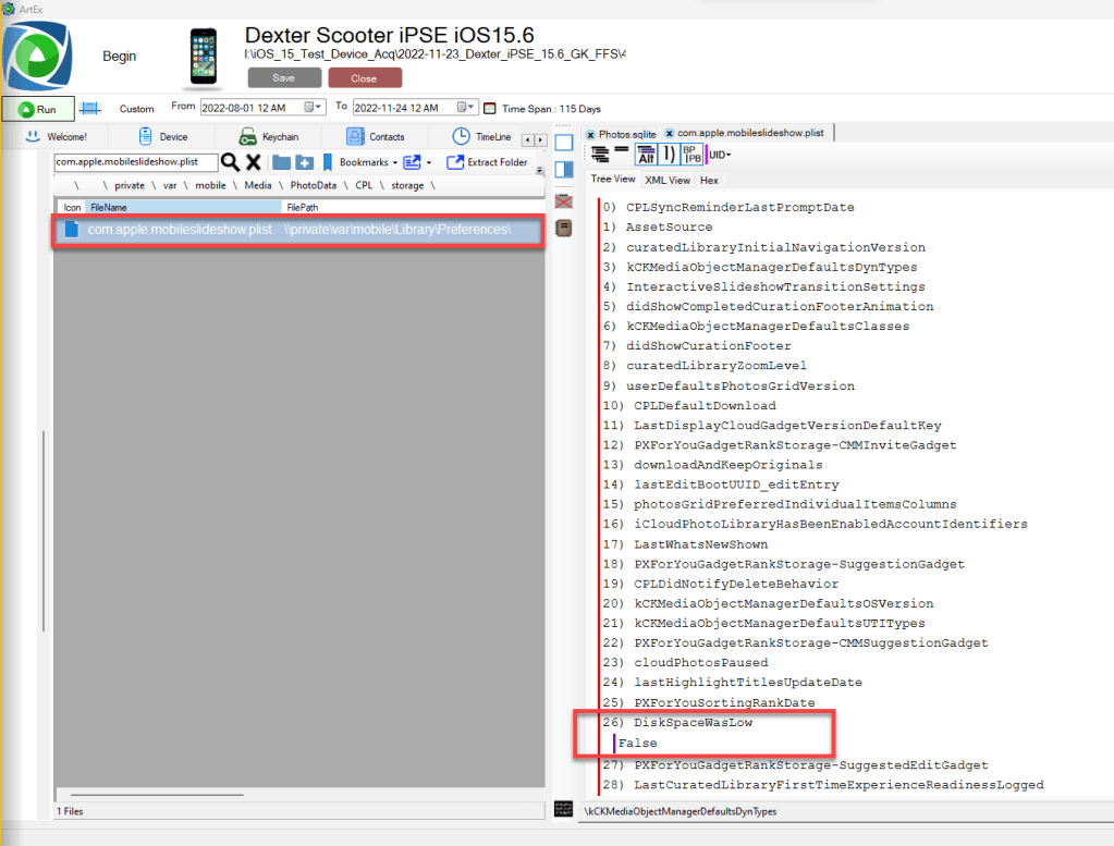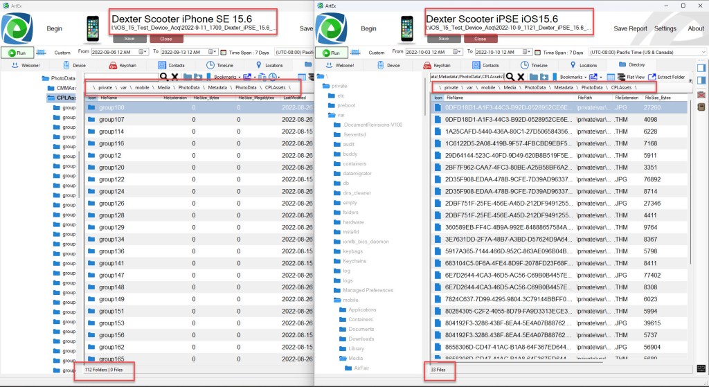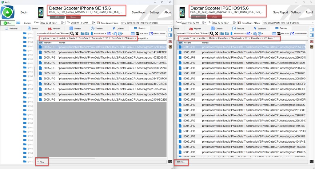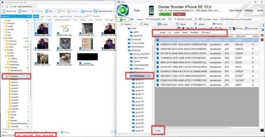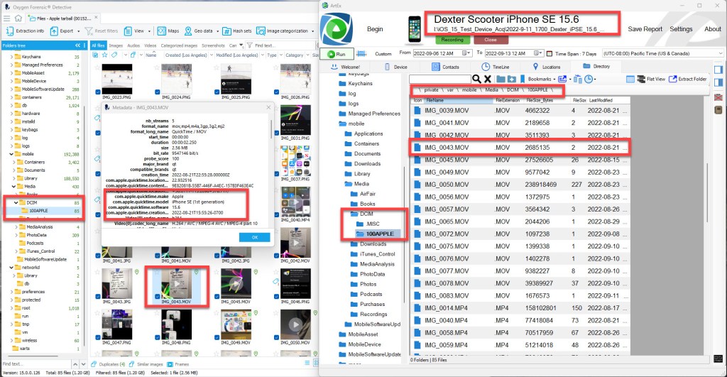 While the iCloud Photos sync data was being acquired, I used the ArtEx live connection and connected to Dexter’s iPhone SE. I reviewed the device data to determine if any of the assets were left behind after the deletion. I conducted a search using the file names. You will notice the Local Photo Library assets are no longer on the device. A message attachment for IMG_0078.MOV was left behind after the deletion. This was a message attachment that was sent to another user during previous testing. This message attachment was not affected when an asset is deleted from the local photo library.