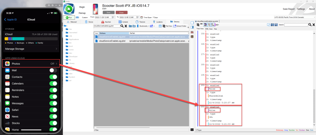 - Examiner indicates in their forensic analysis that cloudServiceEnableLog.plist documented iCloud Photos was turned OFF at 7:01 AM on the date of the seizure…