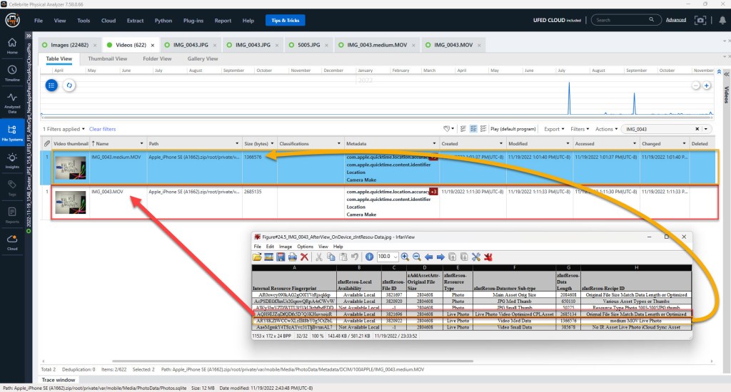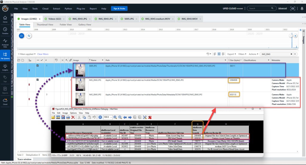 If figure #31, we identified a few assets that were optimized, and we were able to download the original full-sized assets from iCloud Photos using Elcomsoft Phone Breaker. Those assets were: