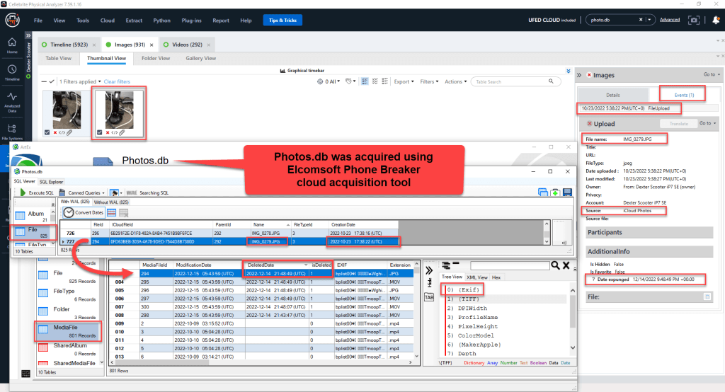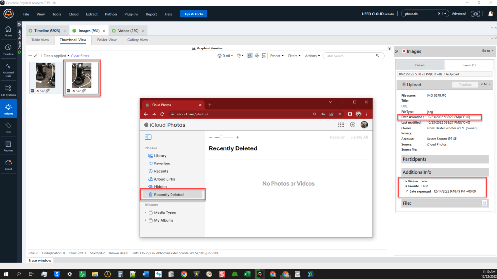 On 12/22/2022, I used a new released version of Cellebrite Physical Analyzer and Cloud Analyzer (7.59.1.16). Using Dexter’s credentials, I was able to acquire Dexter’s iCloud account iCloud Photos sync data. This acquisition was able to acquire the assets that have been synced and recover the deleted assets previously acquired/recovered on 12/20/2022. This data acquisition did not include the Photos.db file that was acquired using Elcomsoft Phone Breaker.