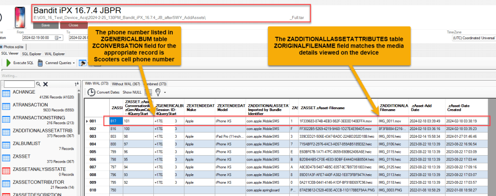 I was a little confused because during my previous research, I did not recall observing data that could be used to show asset to album correlation. Nor did I remember observing phone numbers or emails in the Generic Album table for Shared with You assets. After reviewing some old (iOS 15.1) and newer (iOS 17.2.1) Shared with You Photos.sqlite databases, I was able to locate phone numbers and emails in the ZGENERICALBUM table, as the other examiner described, and the testing and research began.